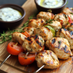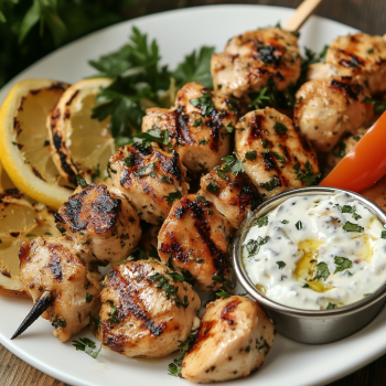 Chicken Souvlaki is a Greek dish made of marinated grilled chicken skewers, typically served with pita, tzatziki, and salad.