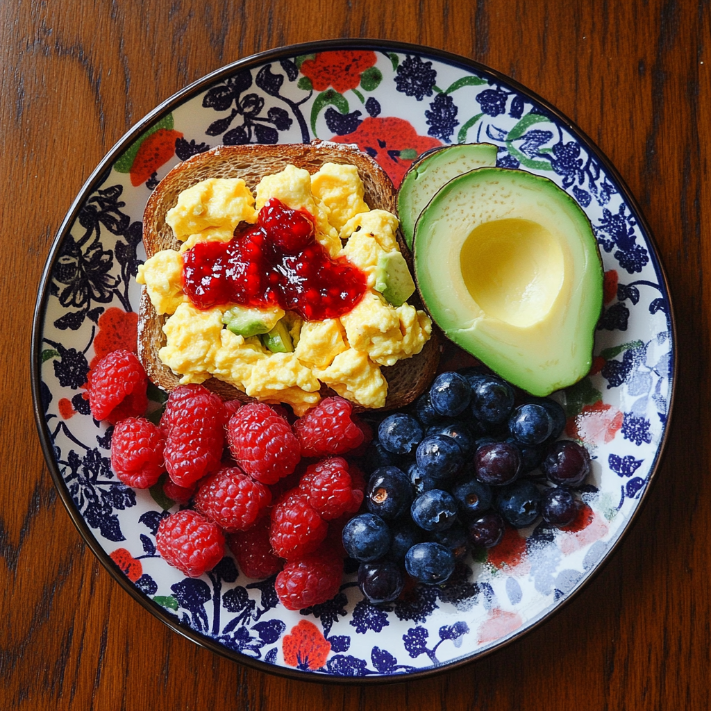 - Serve scrambled eggs alongside avocado and toast, finishing with a generous handful of fresh berries.