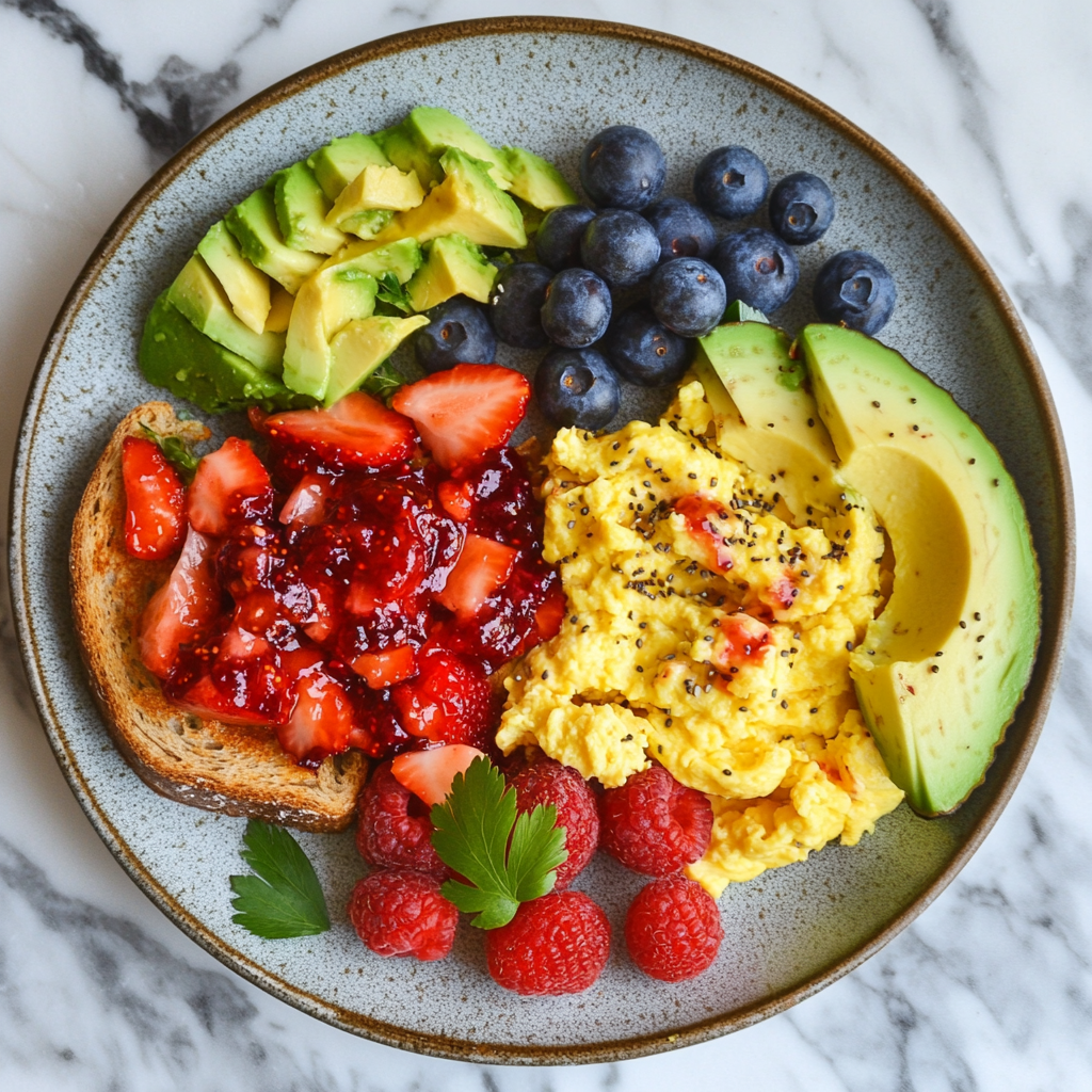 A colorful breakfast plate with scrambled eggs, avocado, PB&J toast, and fresh berries is the perfect way to kickstart your day. This meal is not only visually appealing but also packed with nutrients. It’s suitable for various occasions, whether you’re enjoying a cozy weekend brunch or need a quick weekday breakfast. The combination of protein from the eggs, healthy fats from the avocado, and the sweetness of fresh berries makes it a standout choice for any breakfast lover.